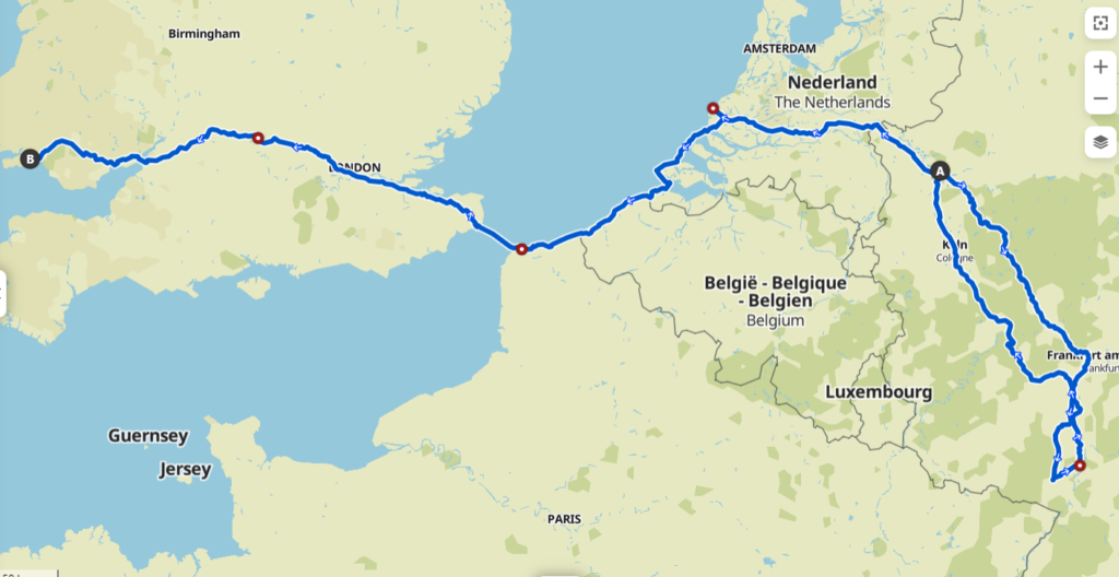 Diese Route werden Deborah und ich 2022 fahren bzw. von Landau nach Wales mit einem Zwischenstopp in Oberhausen. Von Oberhausen fahre ich zuvor nach Landau.